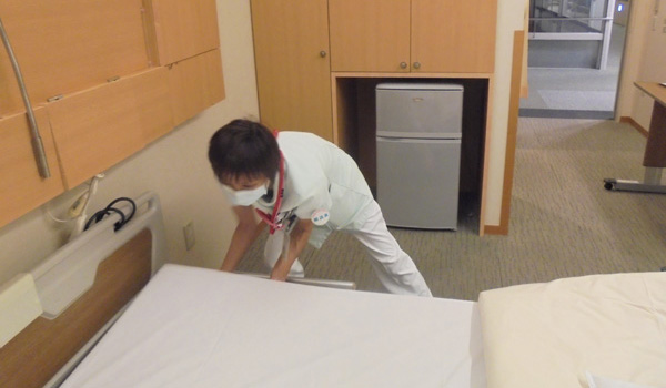 入院患者さんが使用するベッドのシーツ交換やベッド周りの清掃、食事の際に使用するオーバーテーブルの清掃などを行います。退院後に次の入院患者さんを迅速に迎え入れることができるよう、他職種と連携しつつ、段取りを組んでスピーディーに対応します。